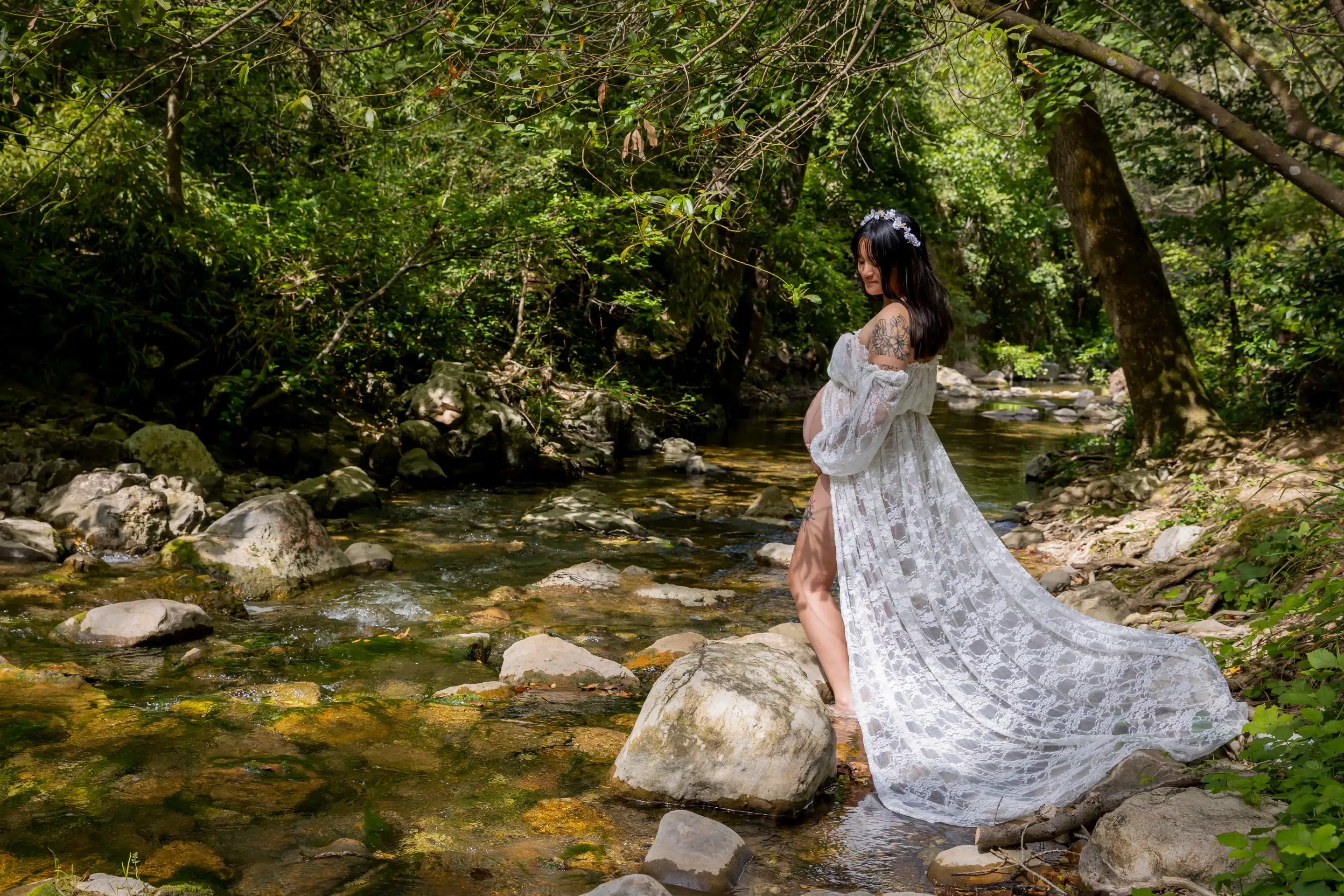 Pour sa deuxième grossesse, elle voulait faire une séance photo en extérieur, et plus particulièrement dans une rivière près de Biot – Valbonne dans les Alpes Maritimes.